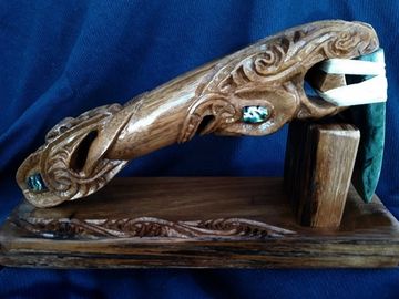 Beautifully carved Greenstone Toki made from Totara a Native timber of NZ